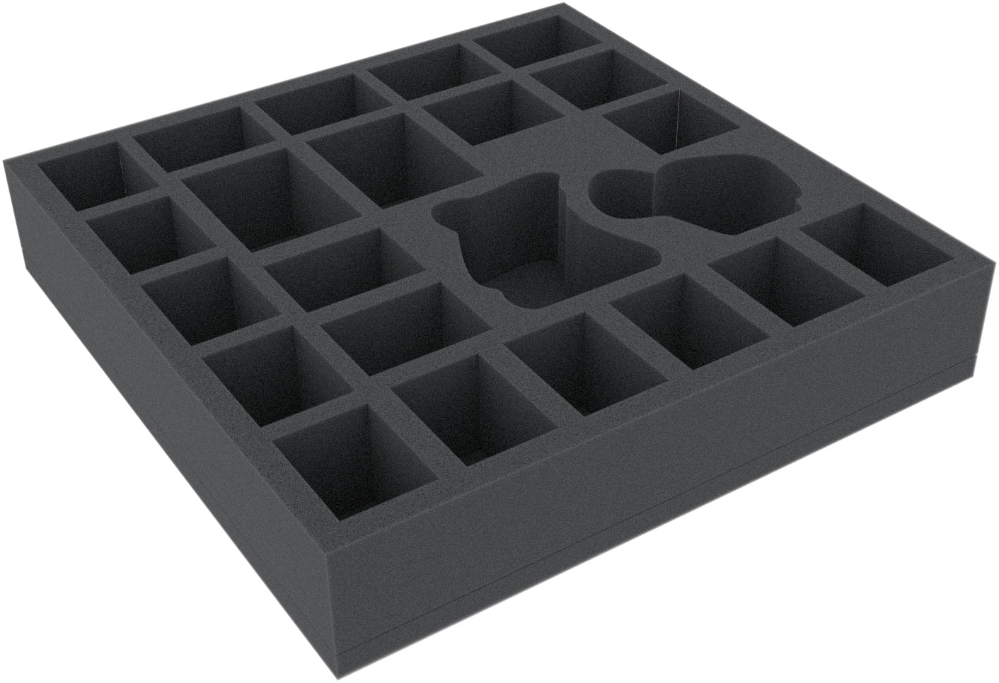 Le plateau en mousse a les dimensions : 265 mm x 265 mm x 50 mm hauteur totale (40 mm hauteur utile + 10 mm base en mousse).