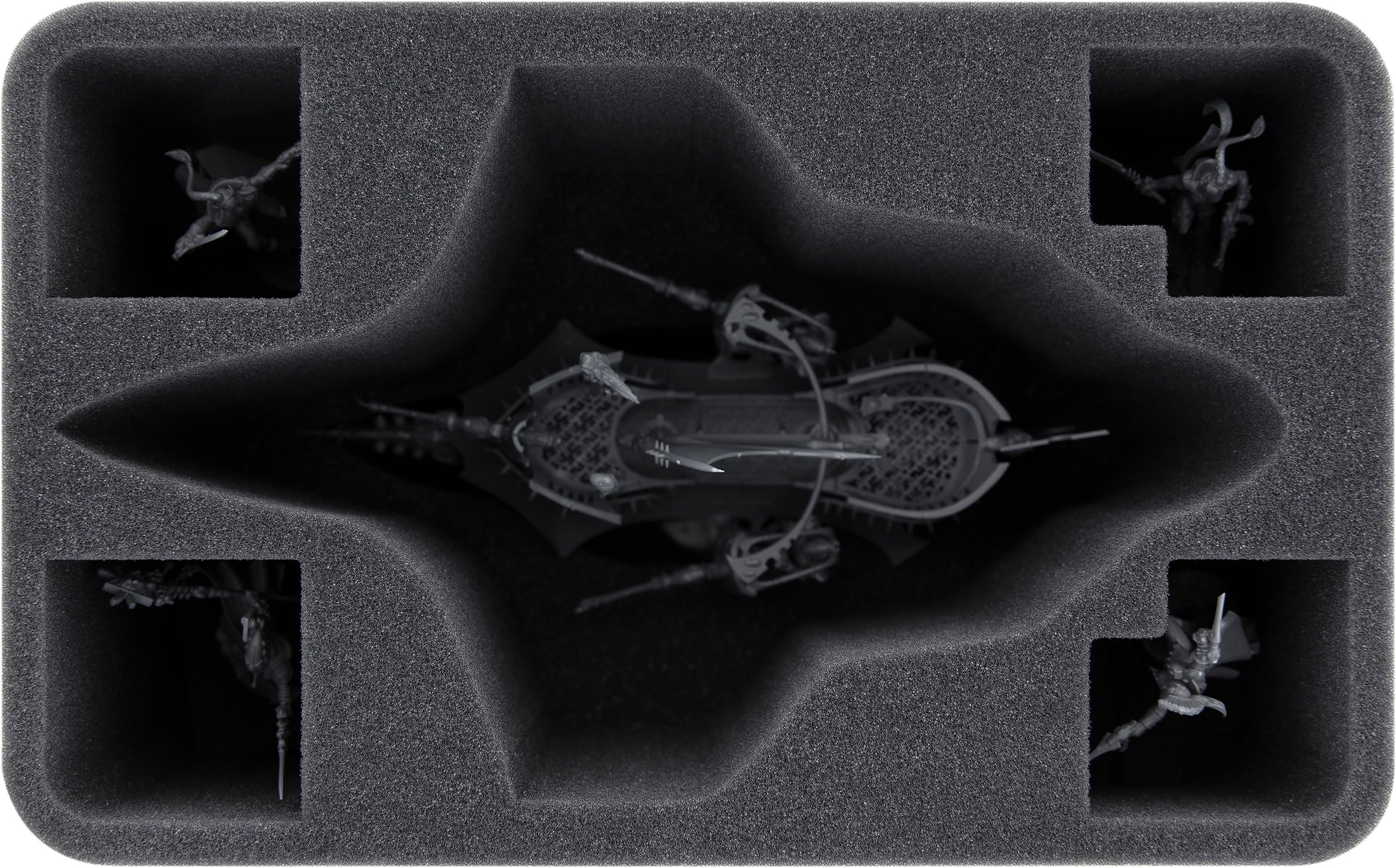 L'insert supérieur de cet ensemble abrite la canonnière du Drukhari. Ici, le modèle en filigrane reçoit un compartiment de coupe précis comme une miniature. Le fond est pourvu d'un évidement pour la base et l'équipement fin à la proue et à la poupe du bateau. La coque du ravager repose solidement sur la mousse sans que les parties sensibles du dessous ne se coincent dans la mousse.