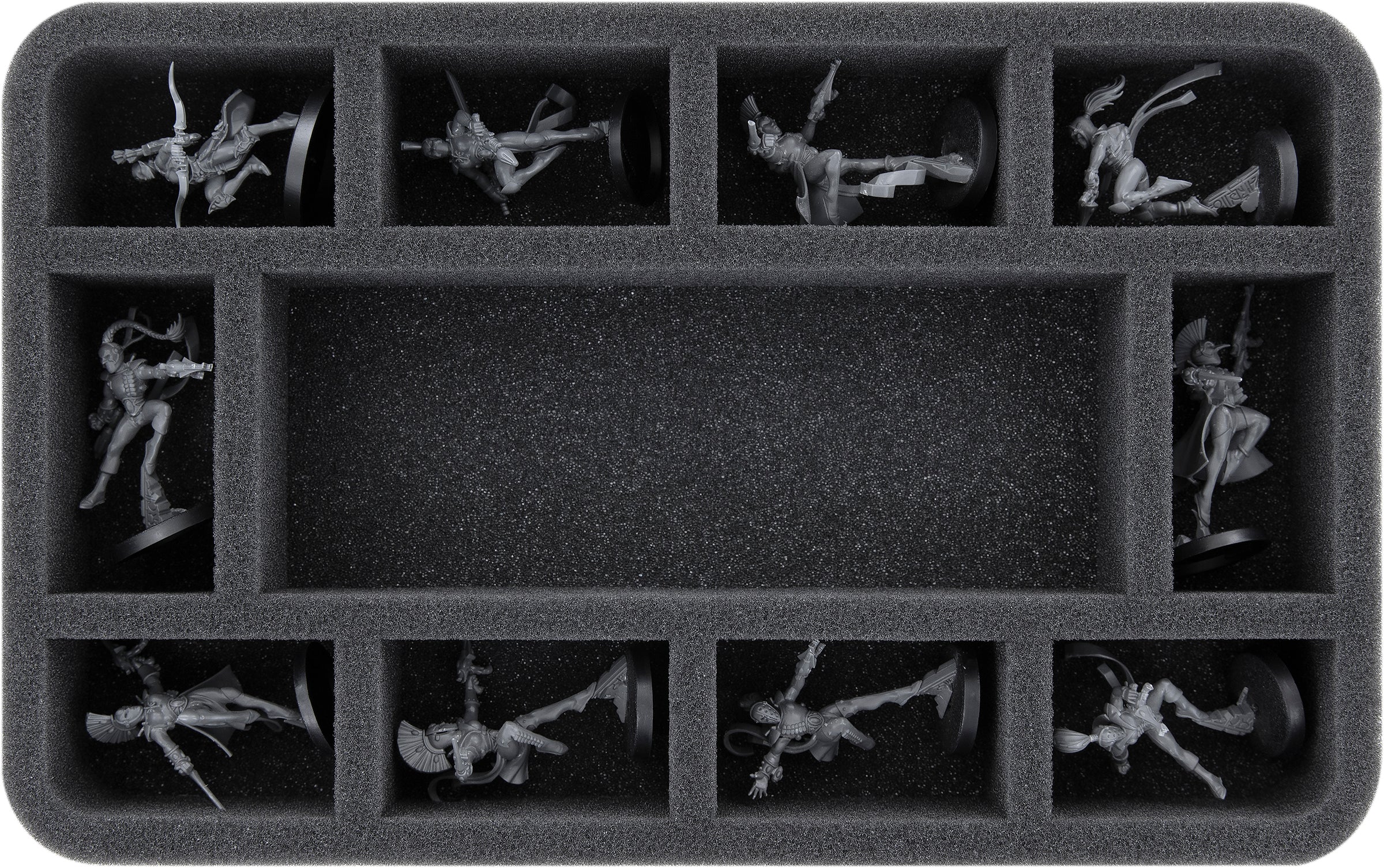 L'insert inférieur de cet ensemble ne sert pas seulement de support pour l'insert supérieur et la base du Ravager. 10 compartiments vous offrent un espace supplémentaire pour d'autres miniatures de votre armée. Ils sont parfaitement adaptés aux modèles d'infanterie et de personnages sur des bases allant jusqu'à 32 mm, comme par exemple plus d'Incubi, de Wyches ou de Guerriers Kabalites.