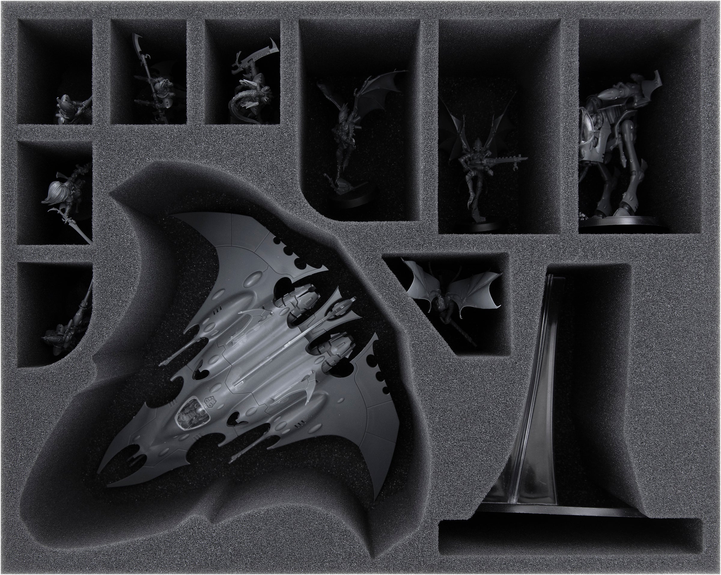 - 1 Full-Size mousses de rangement avec 1 compartiment découpé avec précision pour Hemlock Wraithfighter / Crimson Hunter, 1 compartiment découpé avec précision pour la base volante et 9 compartiments pour les unités sur Jetbikes avec base volante comme Shroud Runners, Windriders, les grandes unités d'infanterie comme War Walker, Winged Autarch, l'infanterie standard comme Howling Banshees, Dire Avengers et les modèles avec des dimensions similaires (FSMEXD105BO)