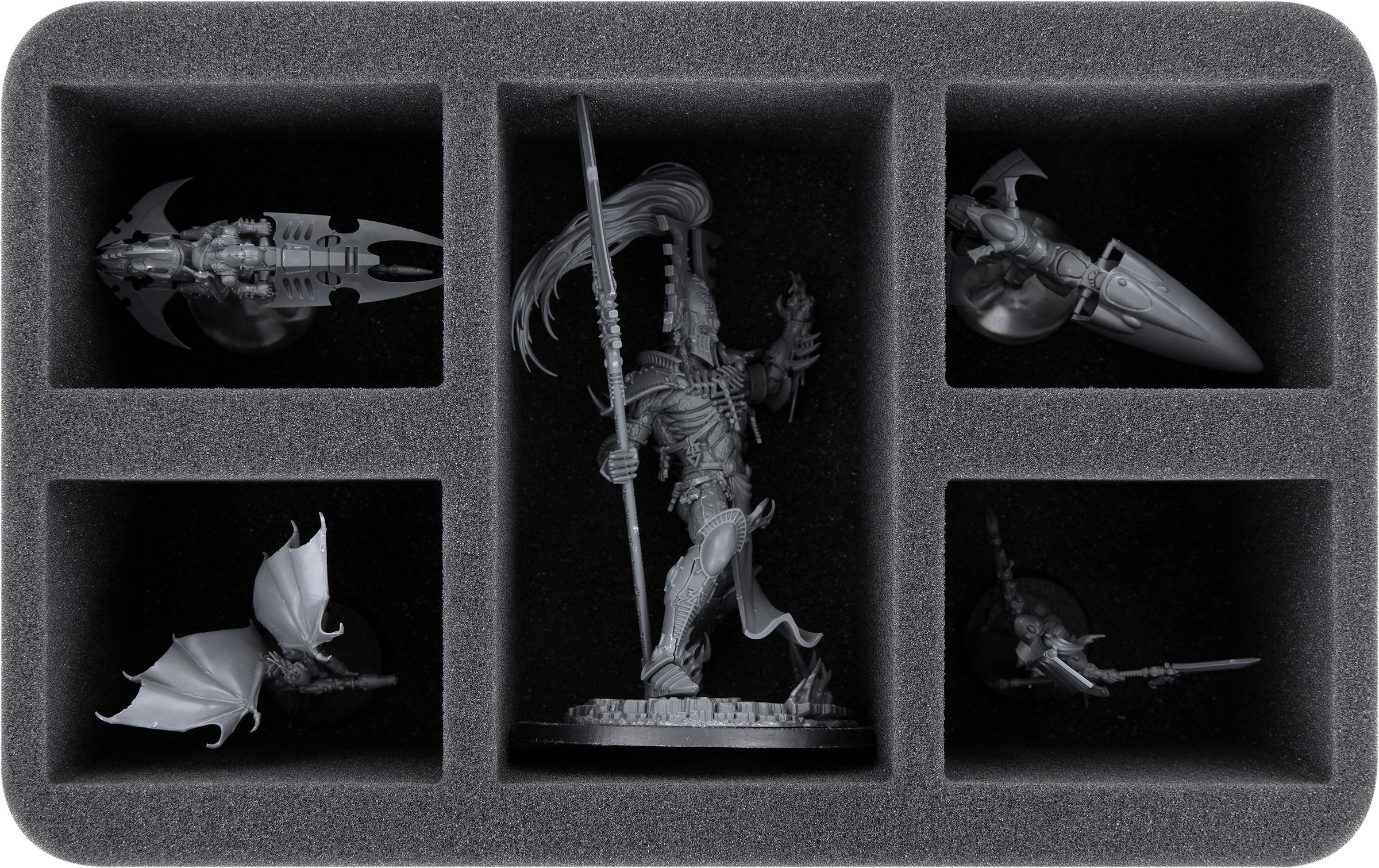 - 1 Full-Size mousses de rangement avec 8 compartiments pour les gros modèles comme les Wraithlords, les unités sur Jetbikes comme les Skyrunners, les Shroud Runners ou les Windriders et les modèles de dimensions similaires (FS090A001)