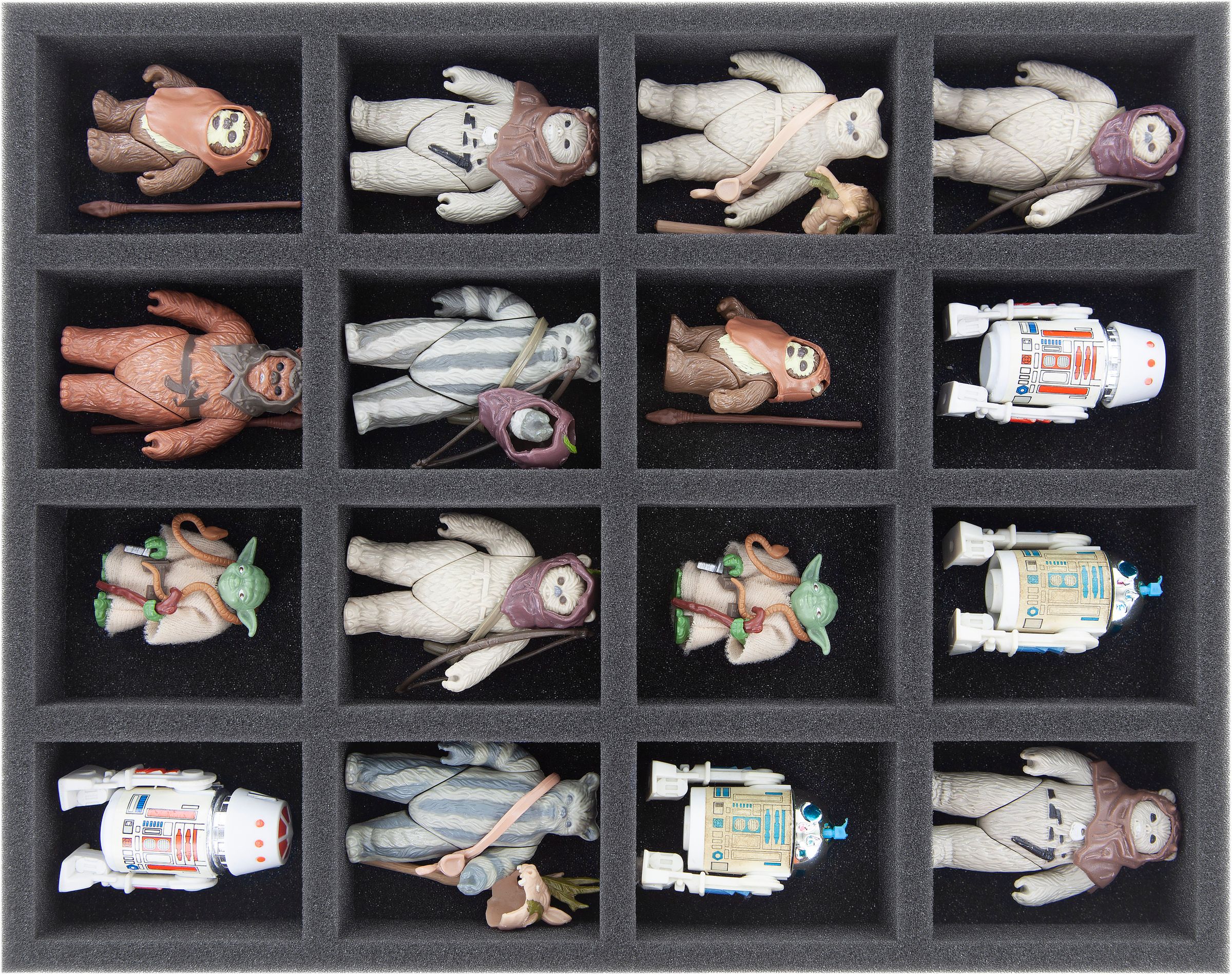 Les plateaux en mousse sont divisés en 16 compartiments de même taille. Il est idéal pour le stockage en toute sécurité de figurines plus petites comme par exemple Yoda ou R2D2. La mousse à pores fins offre une protection ultime contre les dommages - les pièces fragiles restent intactes, les surfaces ne se rayent pas.