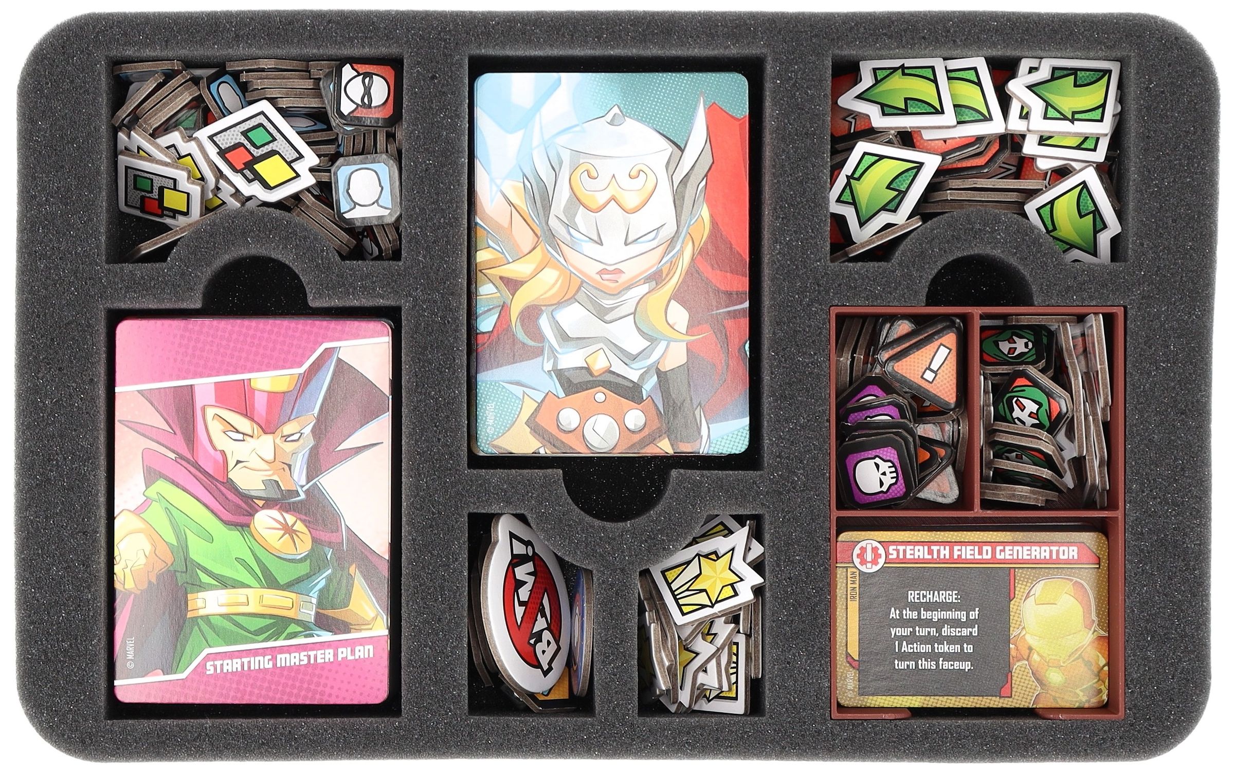 Pour vous faciliter la tâche à long terme, vous pouvez vous procurer la boîte de rangement Feldherr assortie, avec des inserts en mousse personnalisés, pour le jeu de base Marvel United : Multiverse ici.