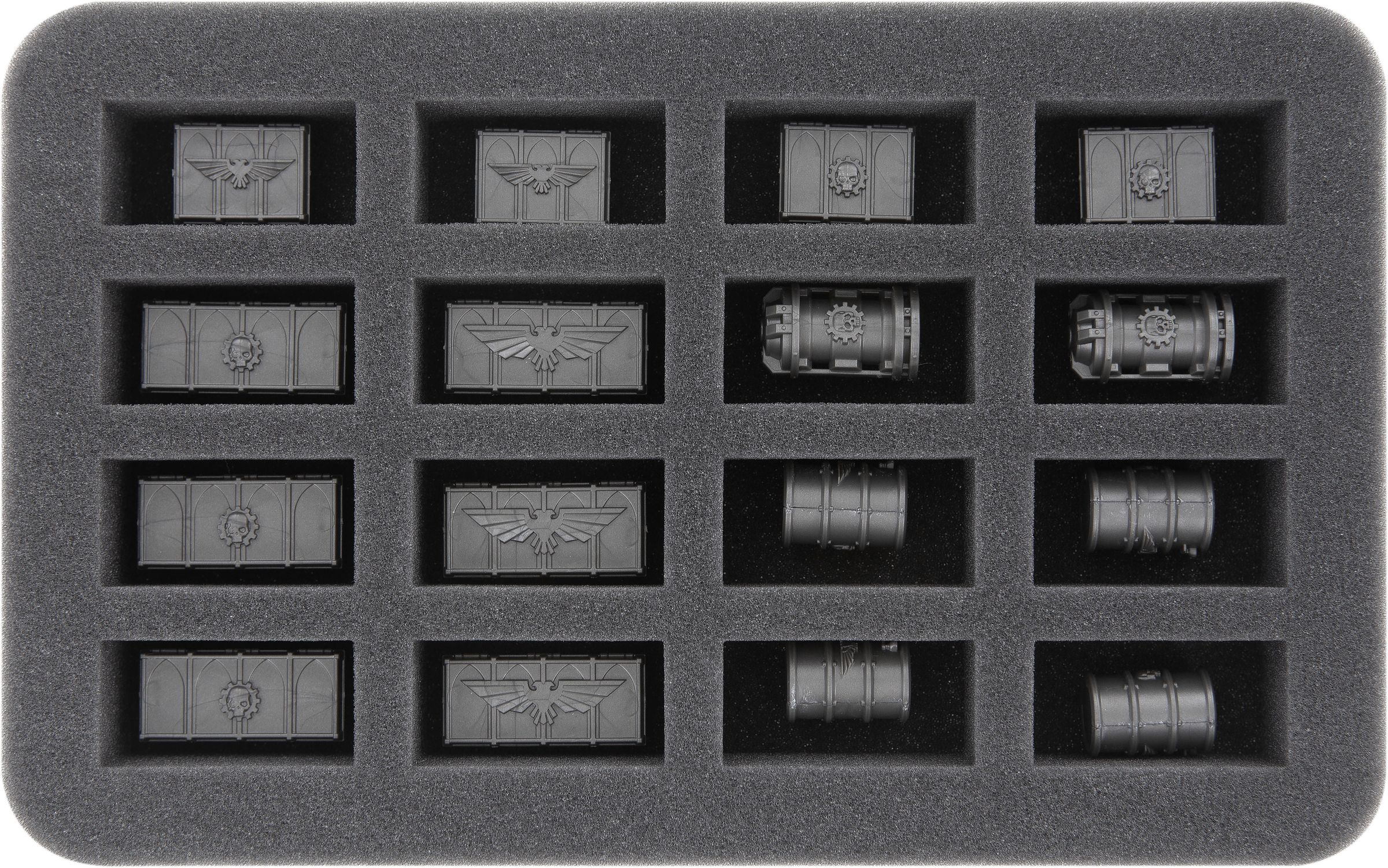 Les trois plateaux en mousse pour les figurines de décors vous permettent de ranger en toute sécurité toutes les portes, les barils, les caisses, les tuyaux et les conteneurs cylindriques de l'Arena Expansion. La mousse à pores fins assure la meilleure protection possible de vos modèles. Les pièces délicates restent intactes, la couleur reste intacte.