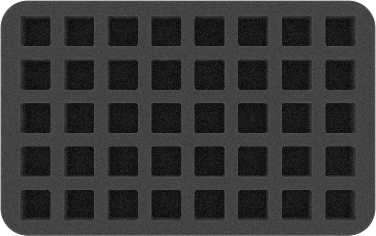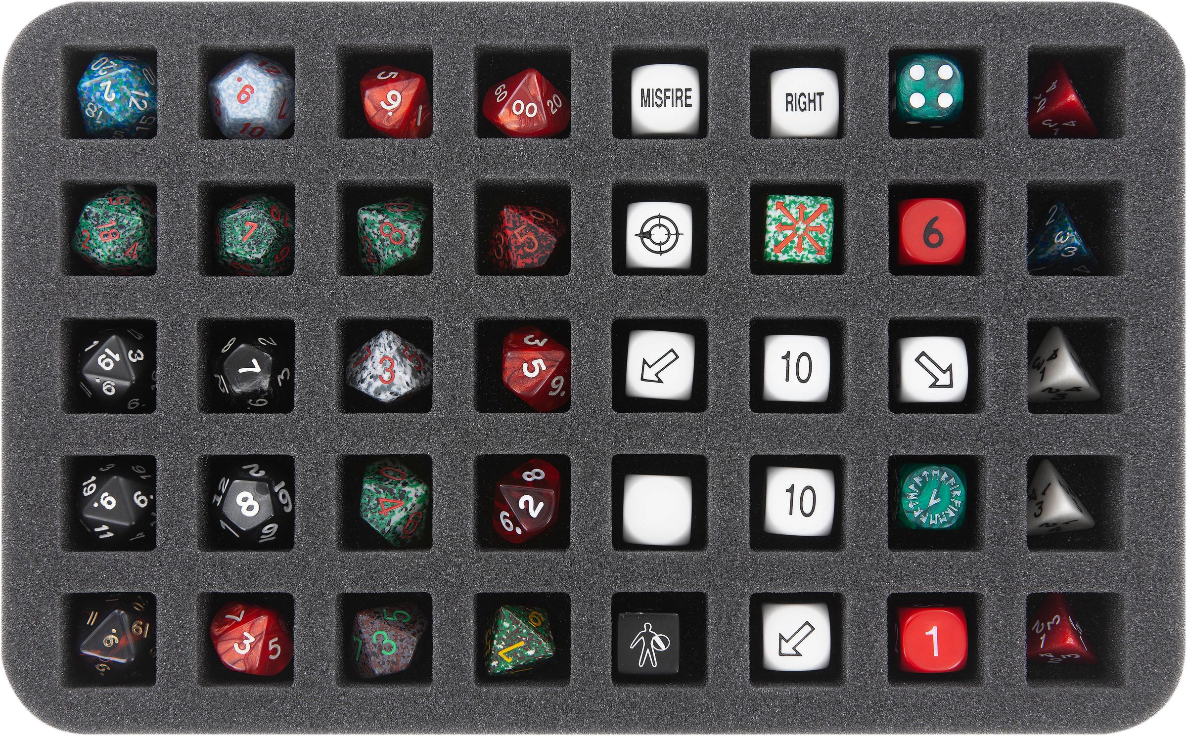Les 40 compartiments du plateau en mousse sont de même taille et sont conçus pour contenir des dés de 22 mm D6, et des dés de taille correspondante avec plus de côtés. Puisqu'il y a un compartiment séparé pour chaque dé, l'abrasion est pratiquement exclue. Et le meilleur de tous, vos dés sont toujours clairement rangés.