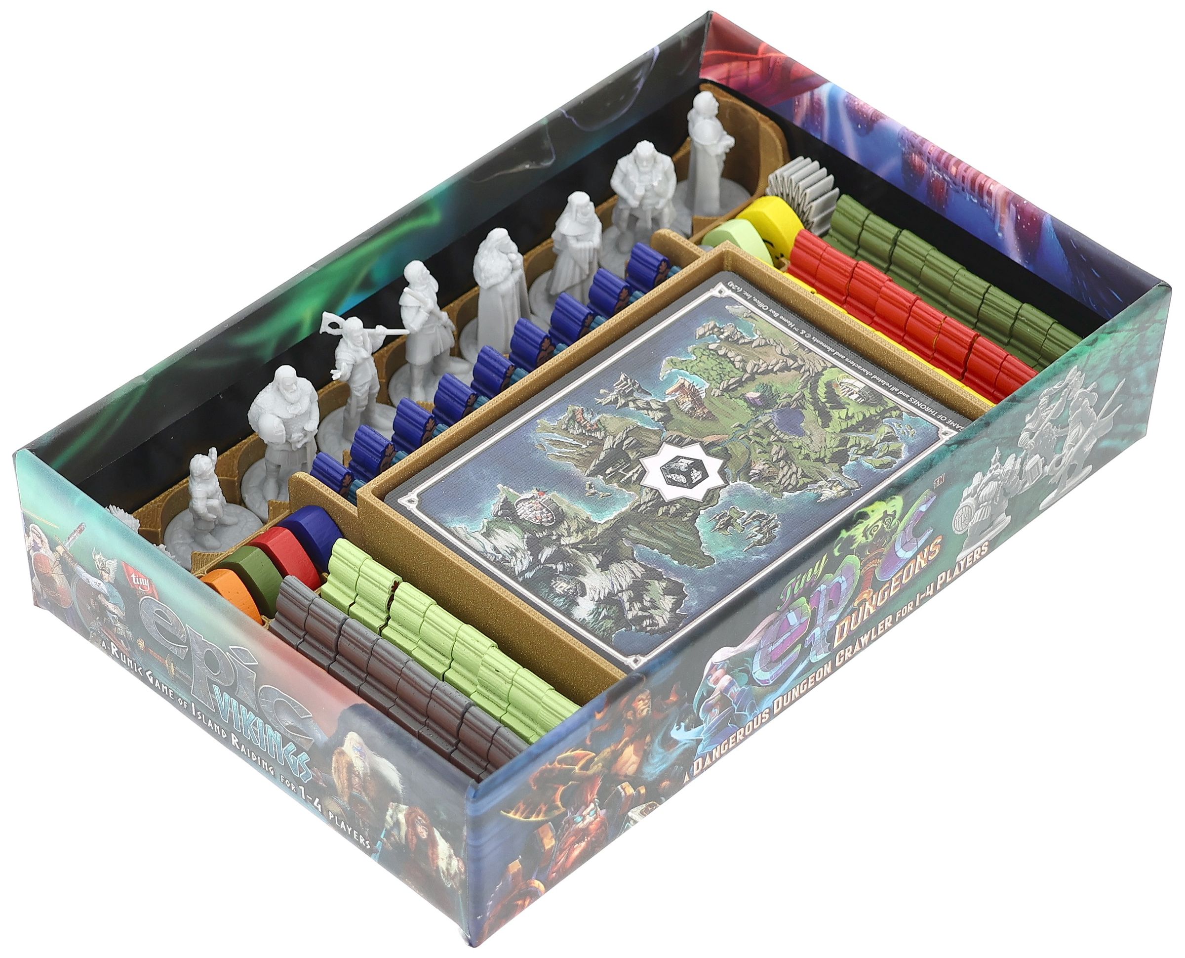Intrigues, batailles et lutte pour le Trône de Fer - Tiny Epic : Game of Thrones allie la fantasy épique à un gameplay astucieux en format de poche. Notre Feldherr Organizer Insert offre une structure claire pour l'édition Deluxe et l'extension Ice and Fire, vous permettant de ranger en toute sécurité vos maisons, meeples et jetons et de garder une trace de tout, même dans les espaces les plus restreints. Il est compact, s'adapte parfaitement et permet de tout ranger proprement.