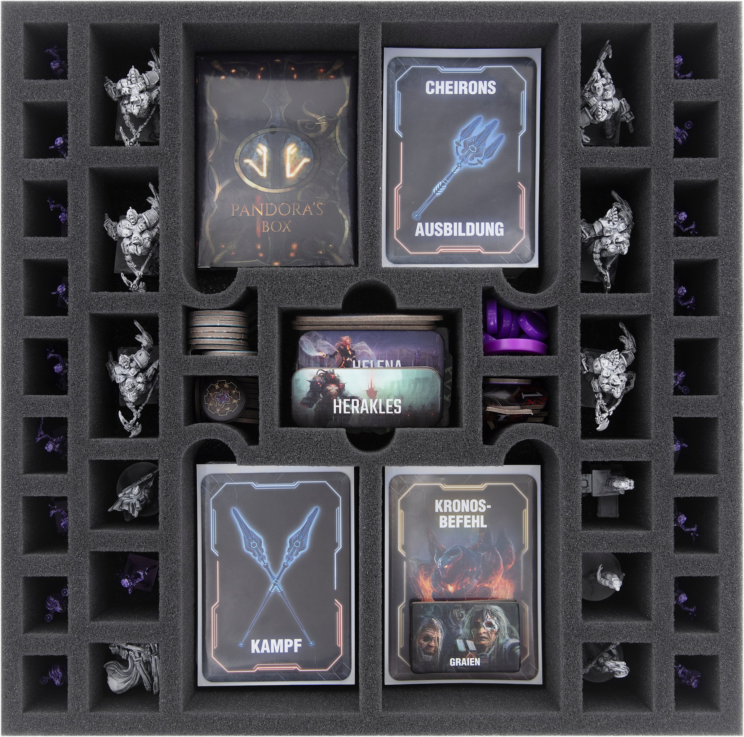 Von Kronos über Hades bis zu Chiron – alle Figuren sind rundum sicher in Schaumstoff gepackt. Der passgenaue Zuschnitt sorgt dafür, dass die Miniaturen auch unterwegs sicher an ihrem Platz bleiben. Das schützt neben den empfindlichen Details auch die Farben bemalter Figuren vor Abrieb und Kratzern.