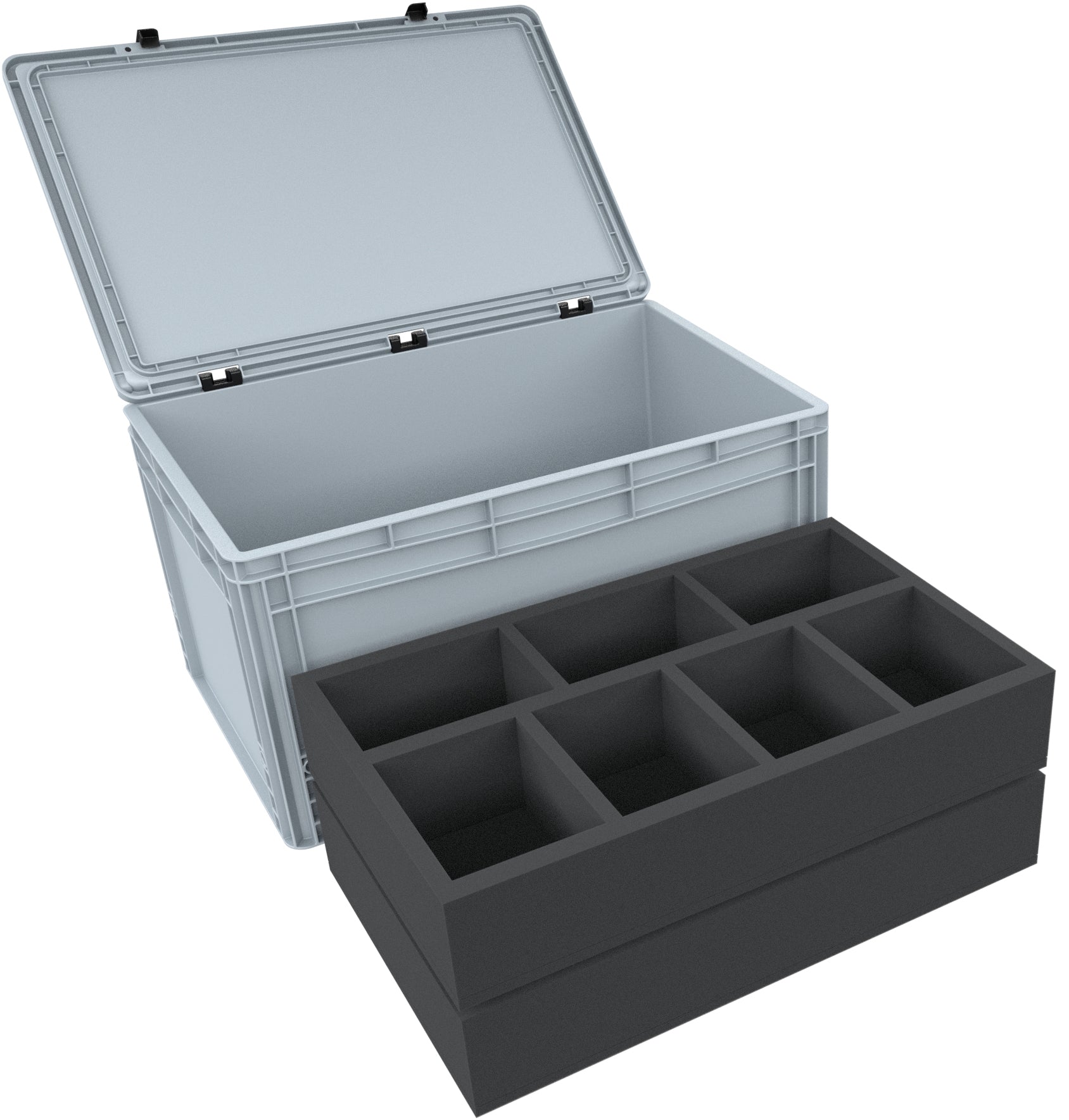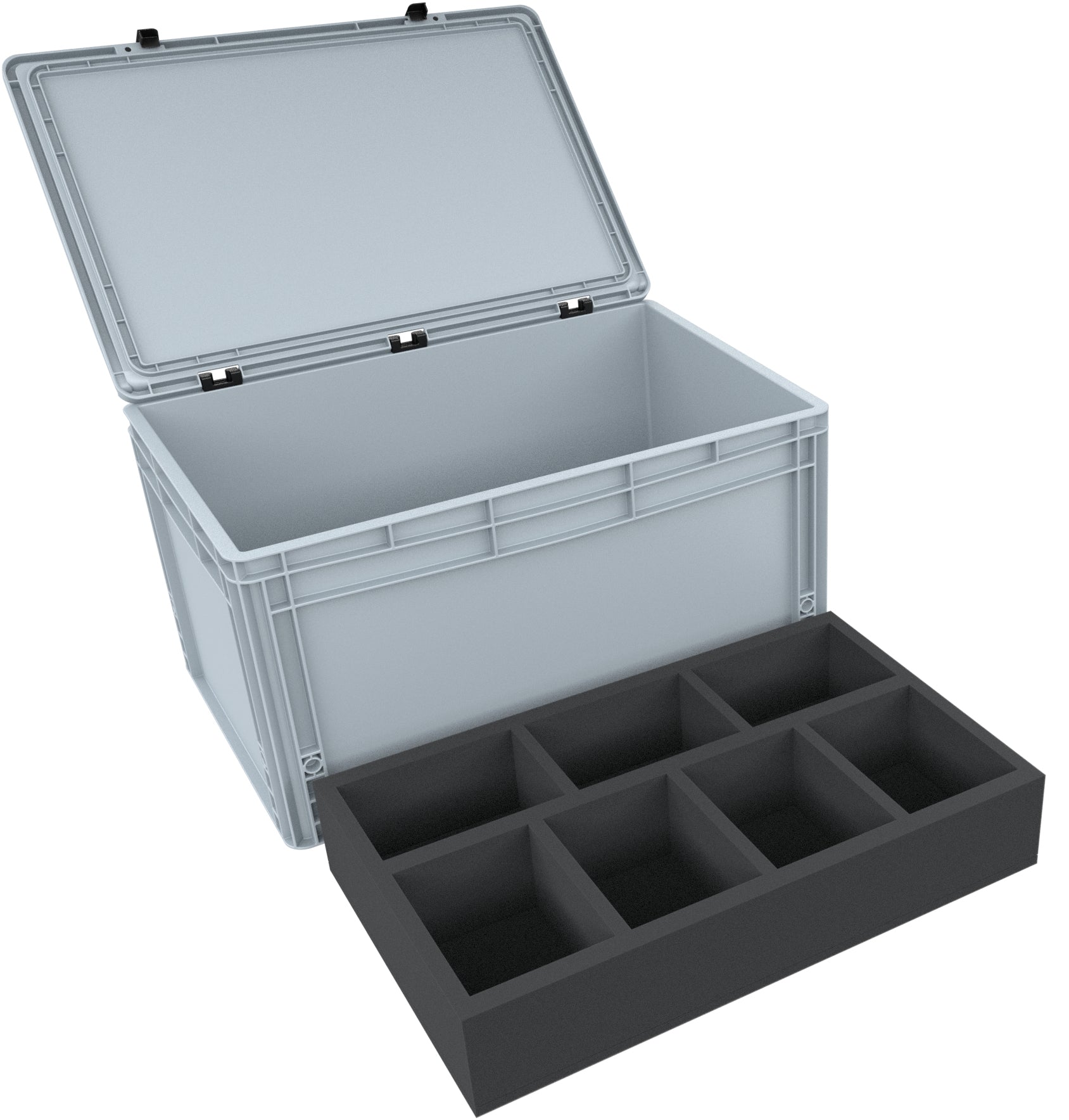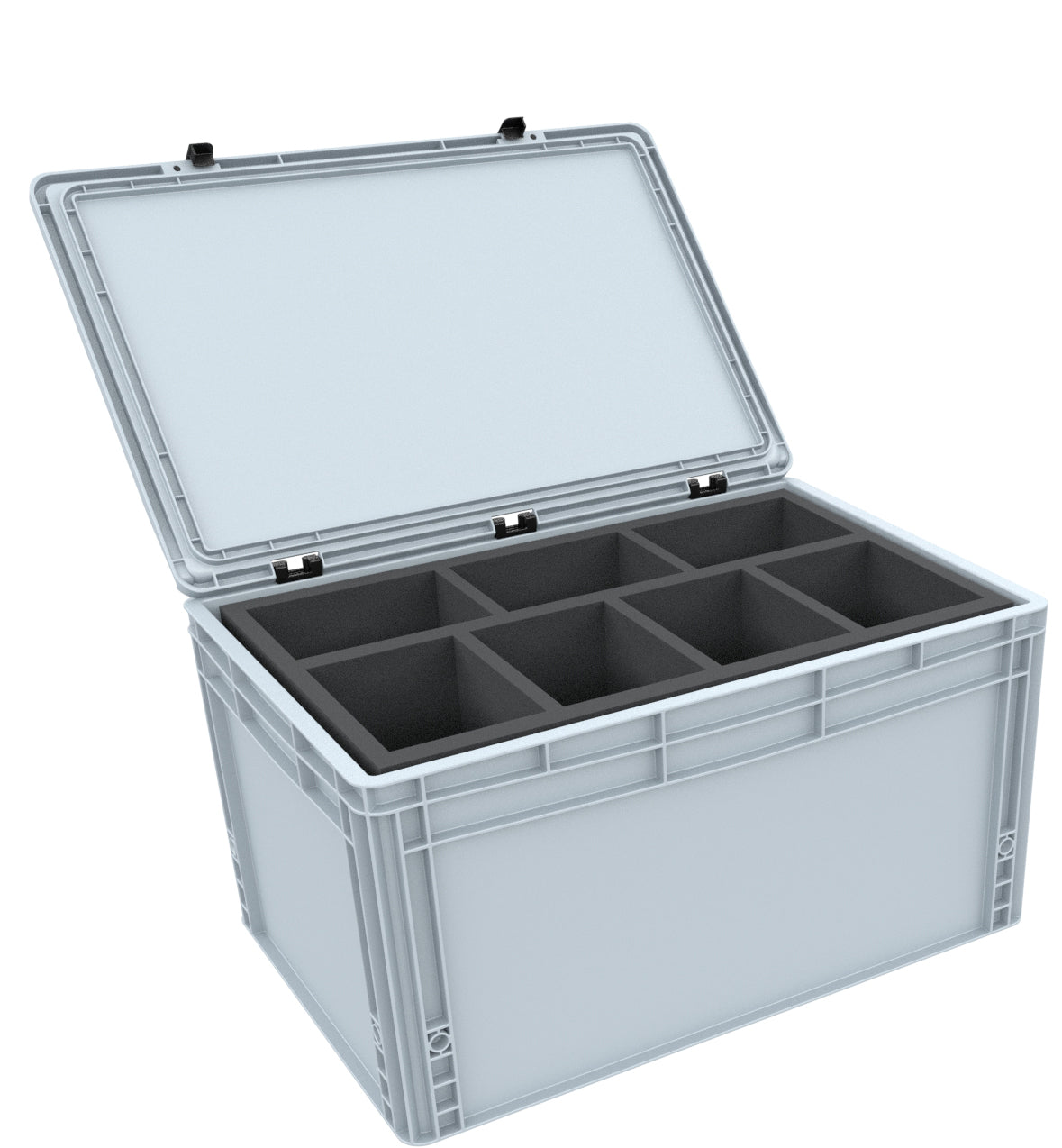With the robust Euro Container from AUER Packaging, made of shockproof and dimensionally stable plastic, your collection is optimally protected against transport damage. The lid, with its easy-to-operate hinge system and two locking levers, reliably protects the contents from dust and dirt. The Euro Box can be lifted with the recessed grips.