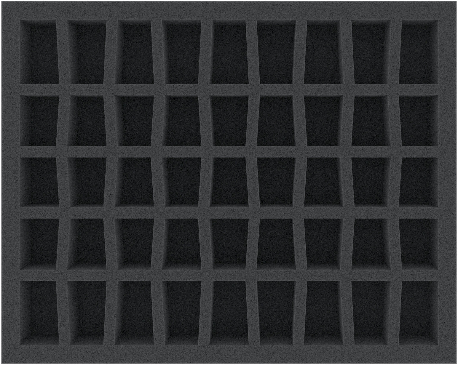 Sur ce plateau en mousse Feldherr, vous avez de la place pour ranger jusqu'à 45 figurines Fallout : Wasteland Warfare. L'insert est particulièrement adapté au rangement de figurines sur base 30 mm et de modèles de taille similaire.