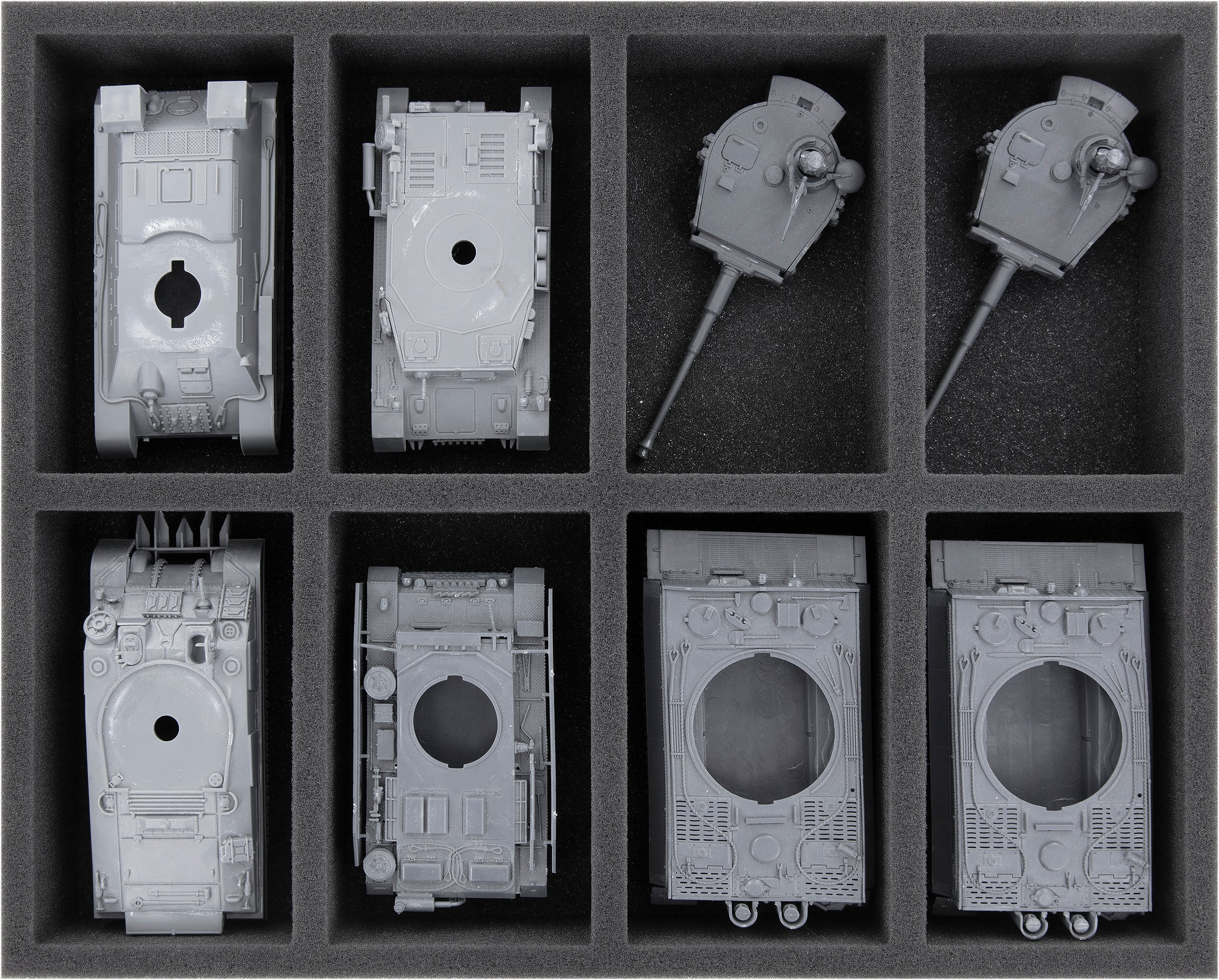 Ce plateau en mousse Full-Size possède 8 compartiments pour le stockage sûr de vos coques de chars Bolt Action. Convient par exemple aux modèles tank III, tank IV, T34, M4 Sherman, Tiger.