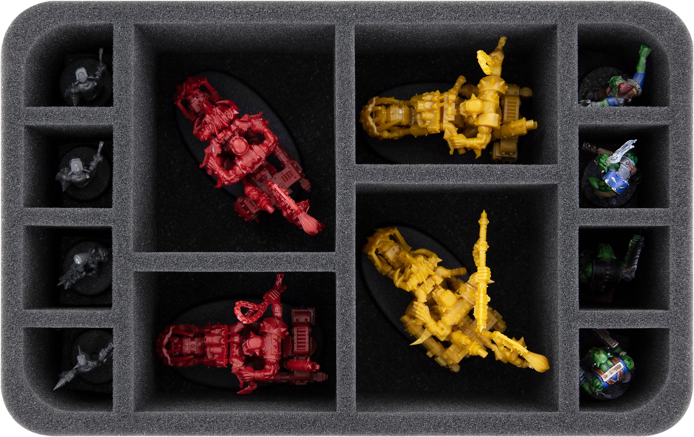 Sur ce plateau en mousse Feldherr, vous pouvez placer jusqu'à 12 figurines de votre armée. L'insert est particulièrement adapté aux Orks on Warbikes, par exemple Ork Warbiker Mob, ou aux Gretchins et autres modèles de taille similaire.